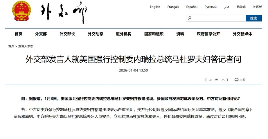 2026年01月04日、中国の外交部が「アメリカ合衆国によるベネズエラ・マドロゥ大統領拘束」事件について以下のプレスリリースを