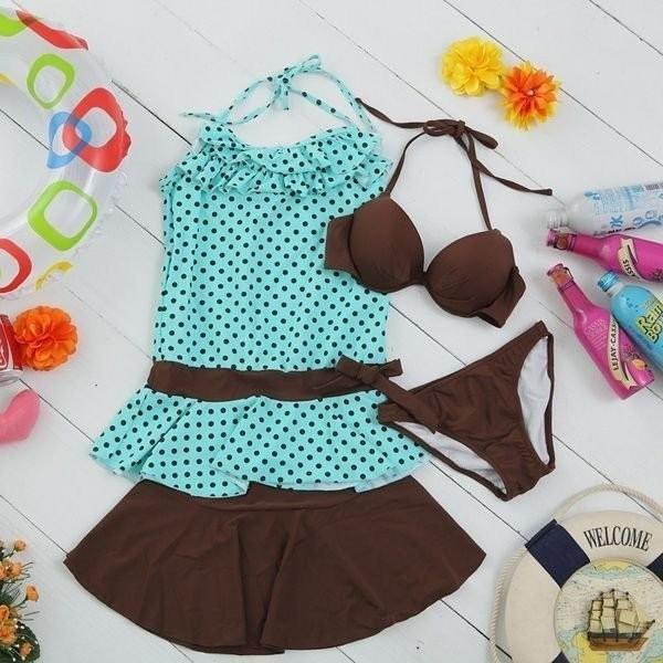 ◆商品詳細◆ 体型がカバーできて、キレイにも見せられるというのが人気の理由です♪ ブラはワイヤー入りなので、スタイルアップの効果もあり! スカートが付属しているので、露出が苦手な方も安心です。 体型が気になるママや妊婦さんにもオススメですよ。 人気のビキニ+タンキニ上着+スカートの4点セットの水着を在庫処分特価で値下げしました! スタンダ水着 タンキニ 体型カバー 水着 ドット柄 ビキニ 4点セット ミント ブラウン