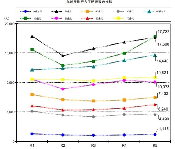 警察庁によると、2023年の行方不明者数は9万144人。コロナ禍以降、その数は毎年増加しています。年齢層別では10歳代の行方不明者数が最も多く1万7732人。9歳以下では、1000名前後の子どもが毎年全国で行方不明になっていることが分かります。