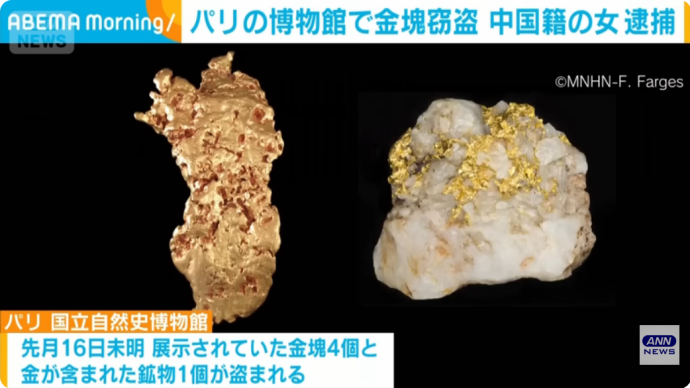 パリの国立自然史博物館で9月16日未明、展示されていた金塊4個と金が含まれた鉱物1個が盗まれました。重さは合わせて約6kgで、金としての価値は150万ユーロ、2億6000万円相当です。