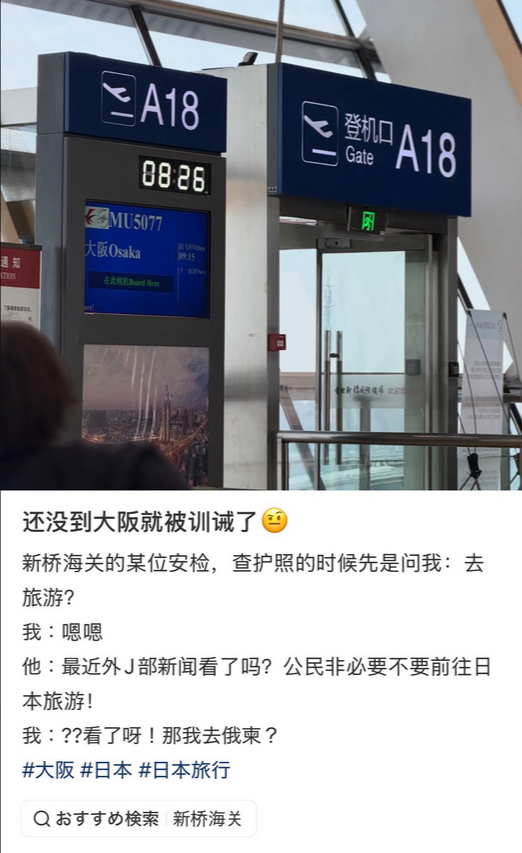 投稿によると、ブロガーは上海虹橋国際空港で出国手続きを行った際、出国審査官から渡航目的を尋ねられ、「日本への観光」と答えたところ、次のような指摘を受けたという。