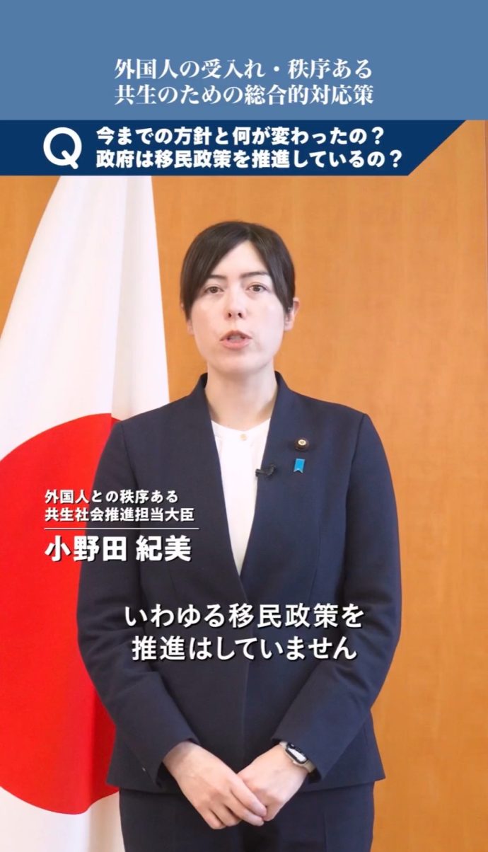 小野田大臣による「外国人の受入れ・秩序ある共生のための総合的対応策」についての解説です。国民の皆様が感じておられる不安や不公平感に向き合い、外国人による違法行為やルールからの逸脱に対しては厳正に対処するなど、外国人との秩序ある共生社会の実現を目指します。 pic.twitter.com/gfEfZTyqEW