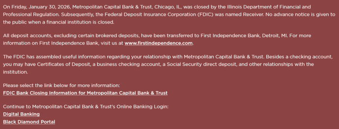 2026年1月30日(金)、イリノイ州シカゴの Metropolitan Capital Bank & Trust は、 イリノイ州金融・専門職規制局 により閉鎖されました。