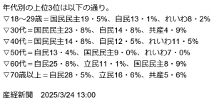0 Screenshot 2025-03-24 at 15-48-50 【産経・FNN合同世論調査】参院選比例投票先、国民民主は18歳から40代まで首位 自民は全体首位も2割届かず 蚤の市★ – まとめくす 2025年03月24日15:49 | カテゴリ: Xで共有