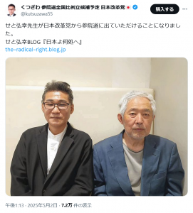 0 Screenshot 2025-05-25 at 12-32-23 (14) Xユーザーのくつざわ 参院選全国比例立候補予定 日本改革党🇯🇵さん 「せと弘幸先生が日本改革党から参院選に出ていただけることになりました。 せと弘幸BLOG『日本よ何処へ』 https __t.co_PvwUUH2hfr https __t.co_s7p1OciwXa」 _ X