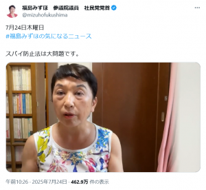 0 Screenshot 2025-07-26 at 16-04-04 (16) Xユーザーの福島みずほ 参議院議員 社民党党首さん 「7月24日木曜日 #福島みずほの気になるニュース スパイ防止法は大問題です。 https __t.co_FjALvVzWMU」 _ X 2025年07月26日16:06 | カテゴリ: Xで共有